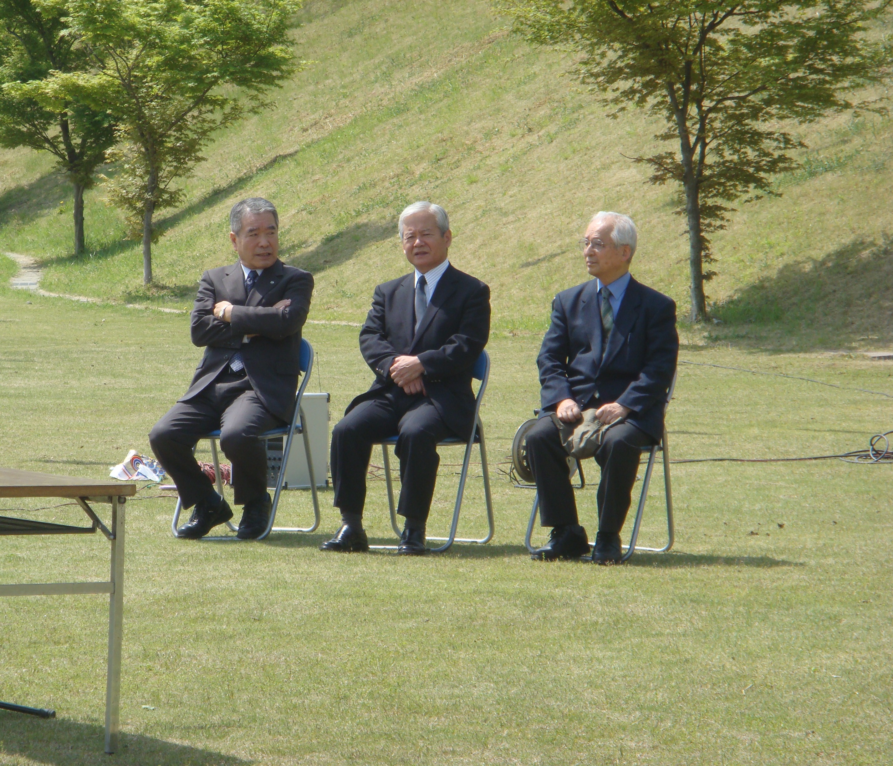 オープニングセレモニー。左から、中村彰太郎那須烏山商工会長、大谷範雄市長、大久保忠且研究会委員長。