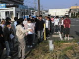 1年生は、高校とは違う大学の講義になれることがまず一番です。本科では、一年前期の都市環境ゼミで10人の先生方の研究室に1年生を仮配属して、都市環境工学の基礎を学びます。管理人はまちづくりが担当ですが、百聞は一見に如かずとばかり、UR都市機構佐野新都市開発事務所にお願いして、現地見学会を行いました。他の研究室や研究室の卒研ゼミ生にも声をかけて大勢でお邪魔しました(「ちゃんと説明聞くんだぜ!」と後ろで監督しているのが管理人です)。